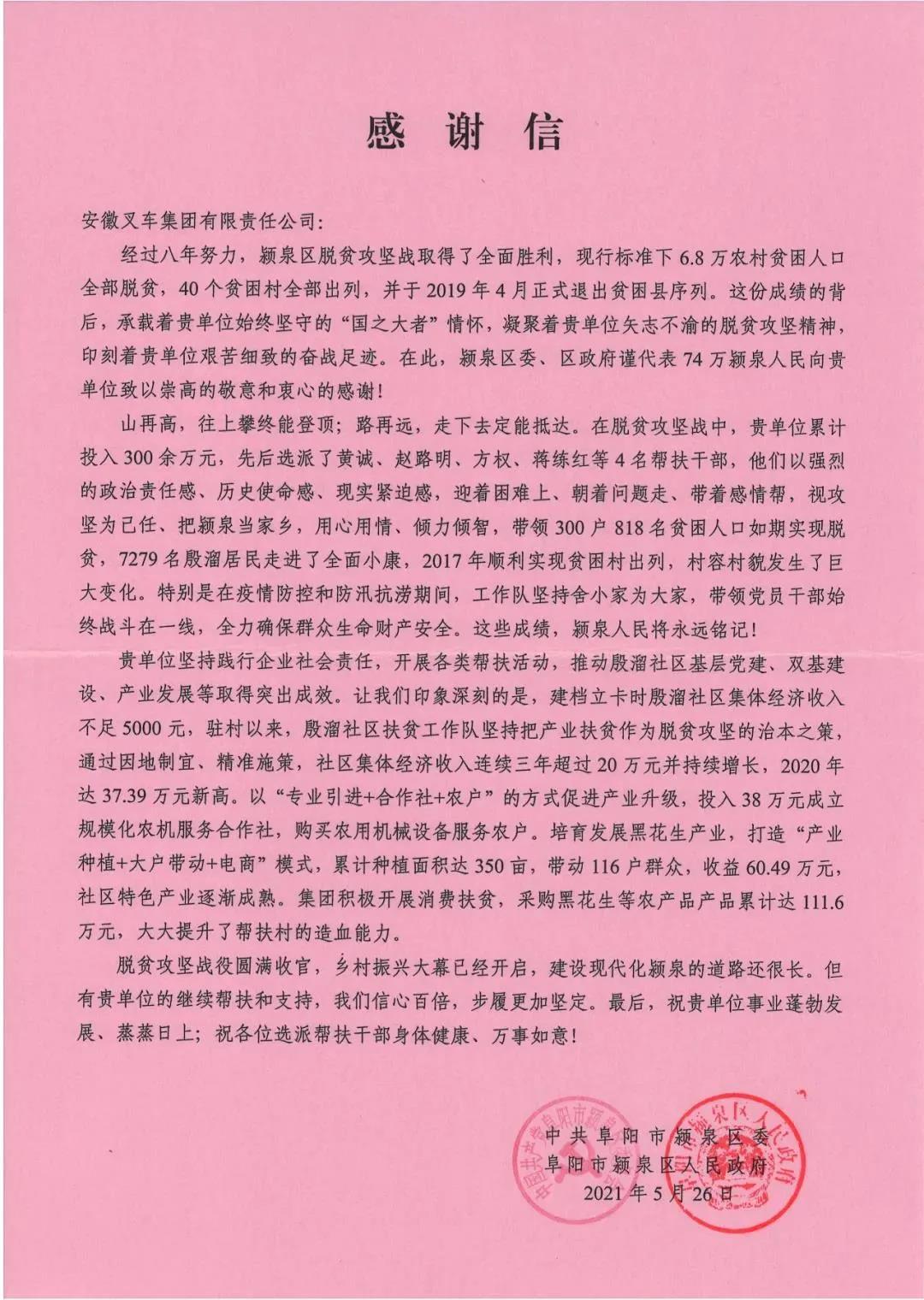 據(jù)悉,在殷溜社區(qū)八年脫貧攻堅戰(zhàn)期間,叉車集團以高度的政治責任感和歷史使命感,迎著困難上、朝著問題走、帶著感情幫,勝利實現(xiàn)殷溜社區(qū)貧困村脫貧摘帽出列,818名建檔立卡貧困人口全部脫貧,7279名殷溜居民走進了全面小康。在此期間,該公司主要領導多次深入幫扶實地,開展調研、走訪座談等活動,研究解決實際問題;駐村工作隊堅持駐村入戶,宣傳、組織落實幫扶政策;黨員干部開展結對幫扶,定期入戶走訪。公司先后累計投入300余萬元,通過開展“黑花生種植”、成立“農機合作社”、落地“扶貧車間”等方式,幫助貧困戶發(fā)展產業(yè),增加集體經濟收入;通過建立“校企實訓基地”、“資助貧困生”,幫助貧困戶掌握技能,成才就業(yè),阻斷貧困代際傳遞;通過落實“雙基建設”,幫助定點幫扶單位改善村容村貌,建設美好鄉(xiāng)村;通過加強“基層組織建設”、開展“文化下鄉(xiāng)”,強化黨建引領,豐富群眾文化生活,形成鄉(xiāng)風文明新風尚。通過因地制宜發(fā)展產業(yè),殷溜社區(qū)年集體經濟收入由建檔立卡時的不足5000元, 到2020年增長至37.39萬元,為社區(qū)走上鄉(xiāng)村振興道路奠定了良好基礎。