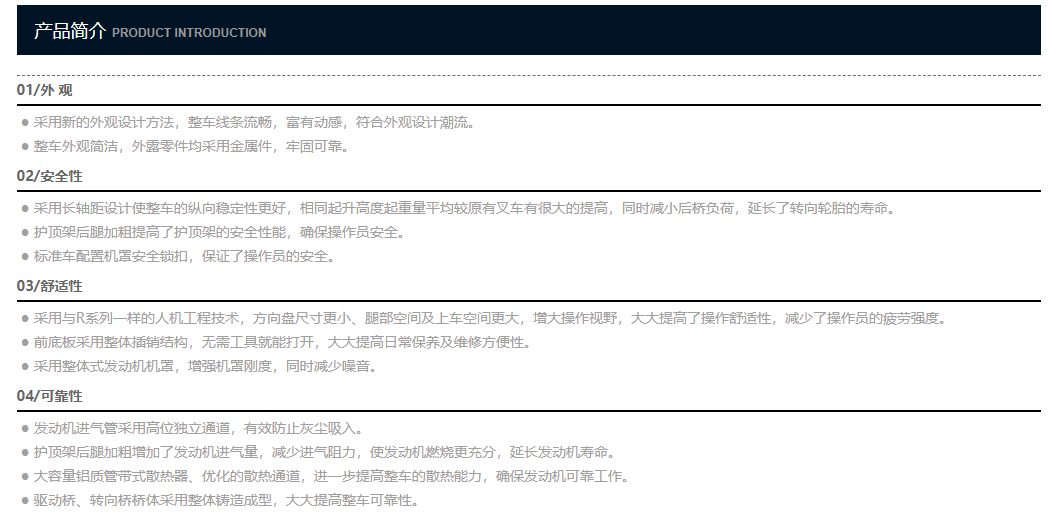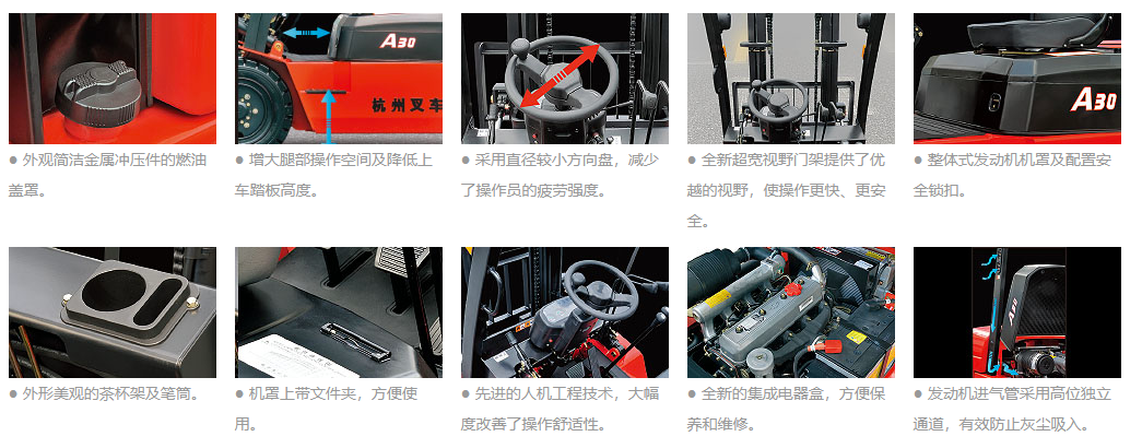 ● A系列是杭叉采用先進(jìn)技術(shù)、在原有產(chǎn)品基礎(chǔ)上,自主開(kāi)發(fā)的全新系列內(nèi)燃平衡重式叉車(chē),通過(guò)對(duì)外觀造型、安全性、舒適性及可靠性的全面升級(jí),使整車(chē)性能較原有產(chǎn)品有了大幅度提高。
